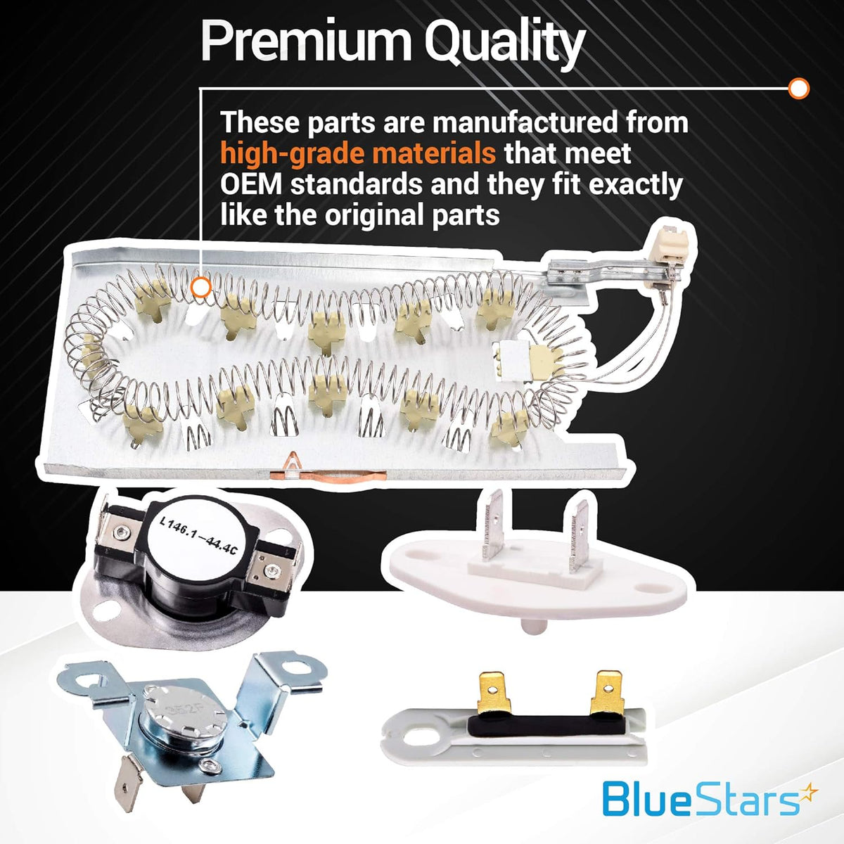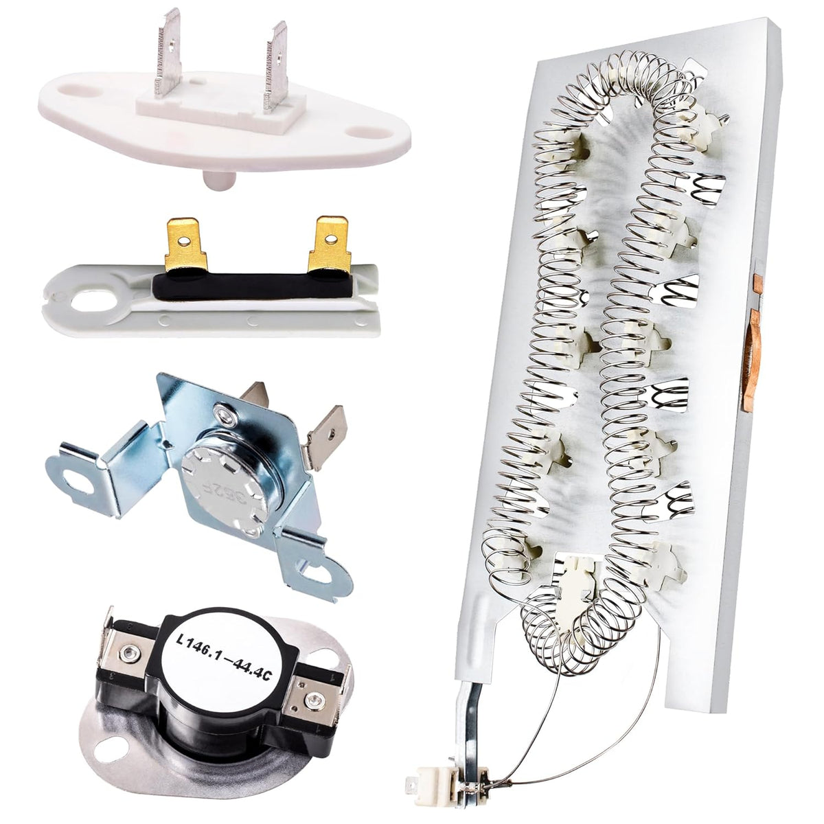 - Complete kit to repair common dryer heating and starting issues.