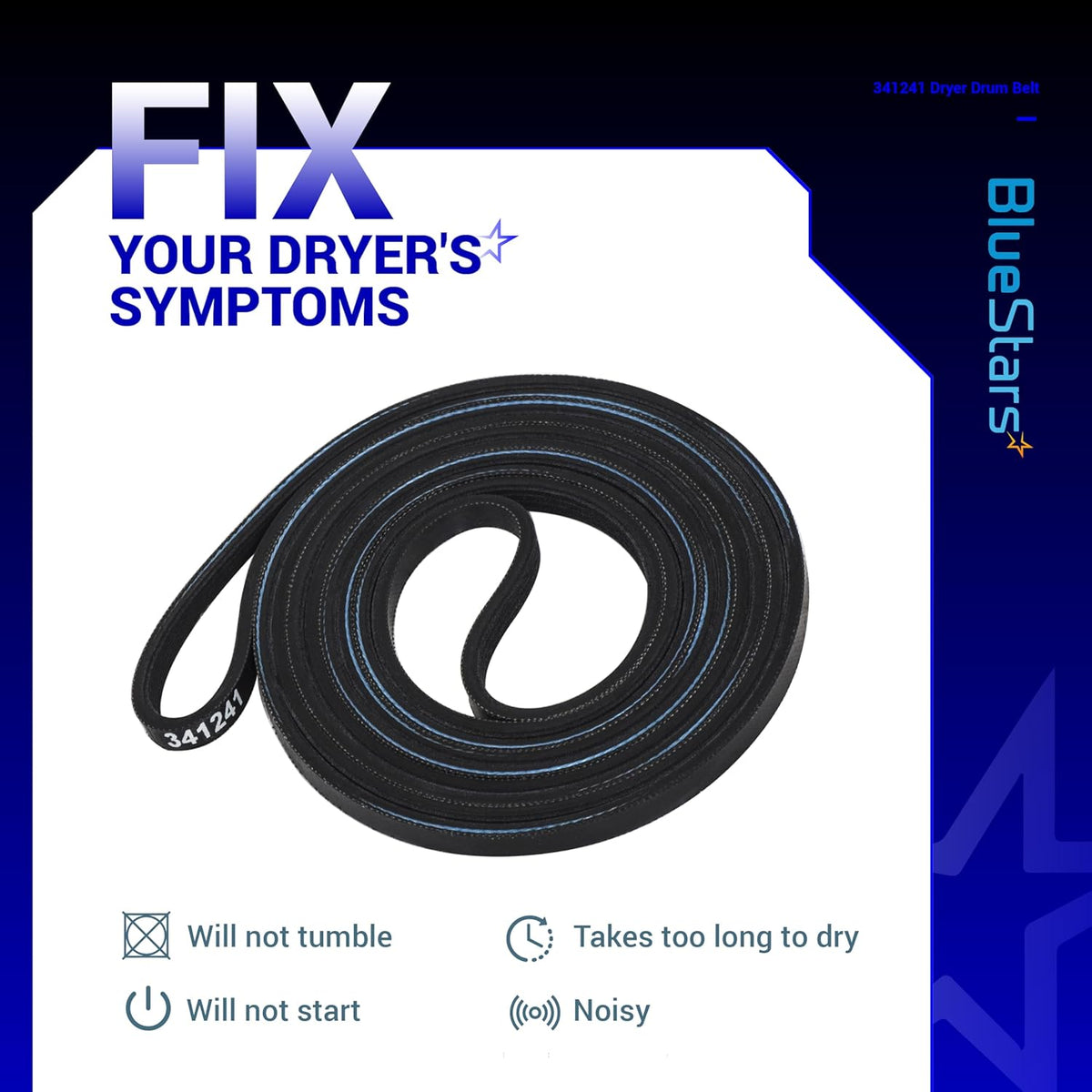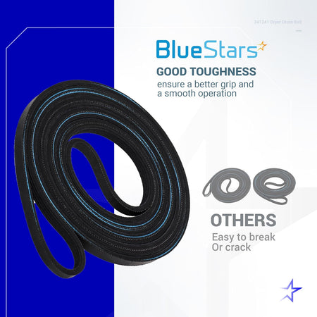 The 341241 Dryer Drum Belt is a high-quality replacement part that wraps around the dryer drum, motor pulley, and idler pulley to rotate the drum during operation. Replacing a worn or broken belt restores proper drum movement and drying performance.