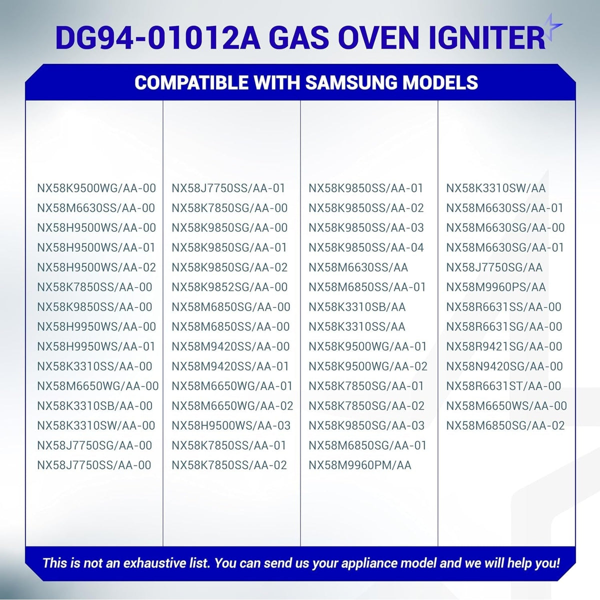 Upgrade your cooking experience with the DG94-01012A Oven Igniter, designed for superior performance and compatibility with a wide range of Samsung gas ovens. This high-quality igniter ensures reliable ignition and longevity, making it an essential component for your kitchen.