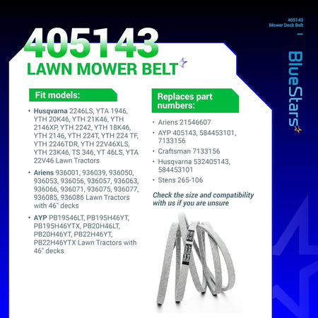 Replace P/N Ariens 21546607; AYP 405143, 584453101, 7133156; Craftsman 7133156; Husqvarna 532405143, 584453101