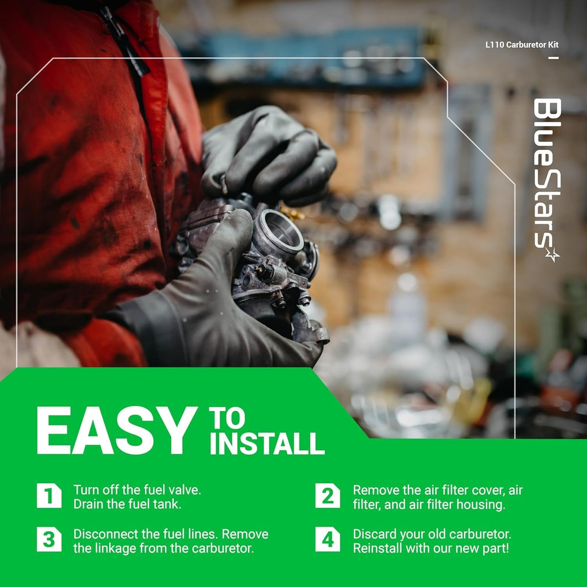- Kit includes 1 carburetor, 2 gaskets, 1 fuel filter, and 1 fuel shut-off valve.