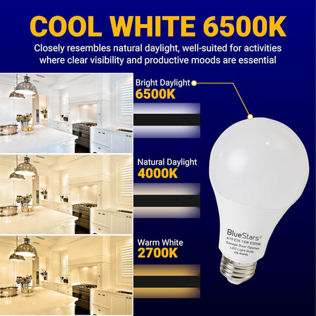 The BlueStars A19 E26 15W LED Bulb is compatible with E26/E27 American standard bases, making it suitable for most garage door openers and easily integrated into any E26/E27 lighting fixture. With 800 lumens of super bright lighting, it is ideal for: