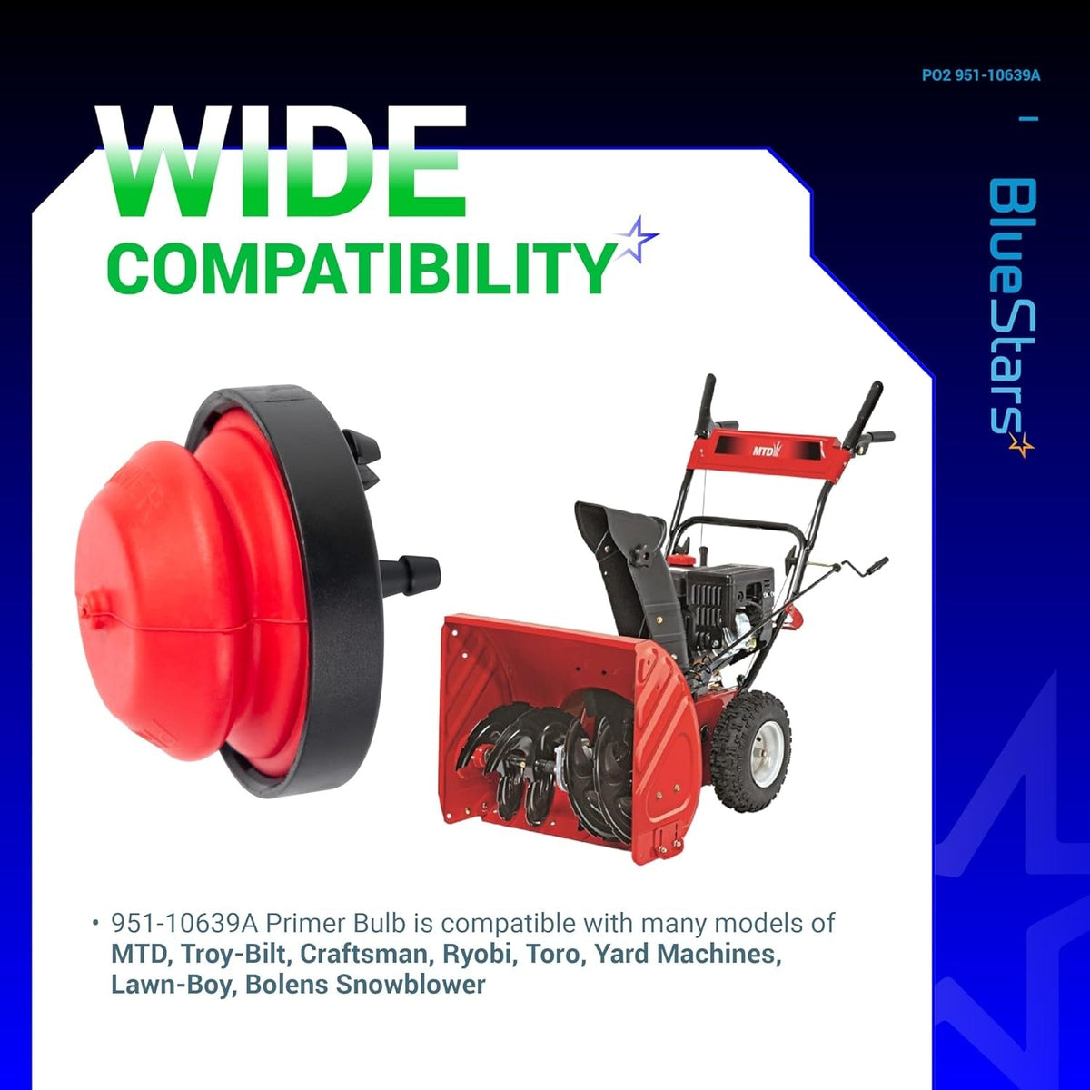 This listing offers a twin-pack of high-quality replacement primer bulbs, specifically designed for various snow thrower models. Each bulb is a direct replacement for part numbers 570682, 951-10639, and 751-10639.