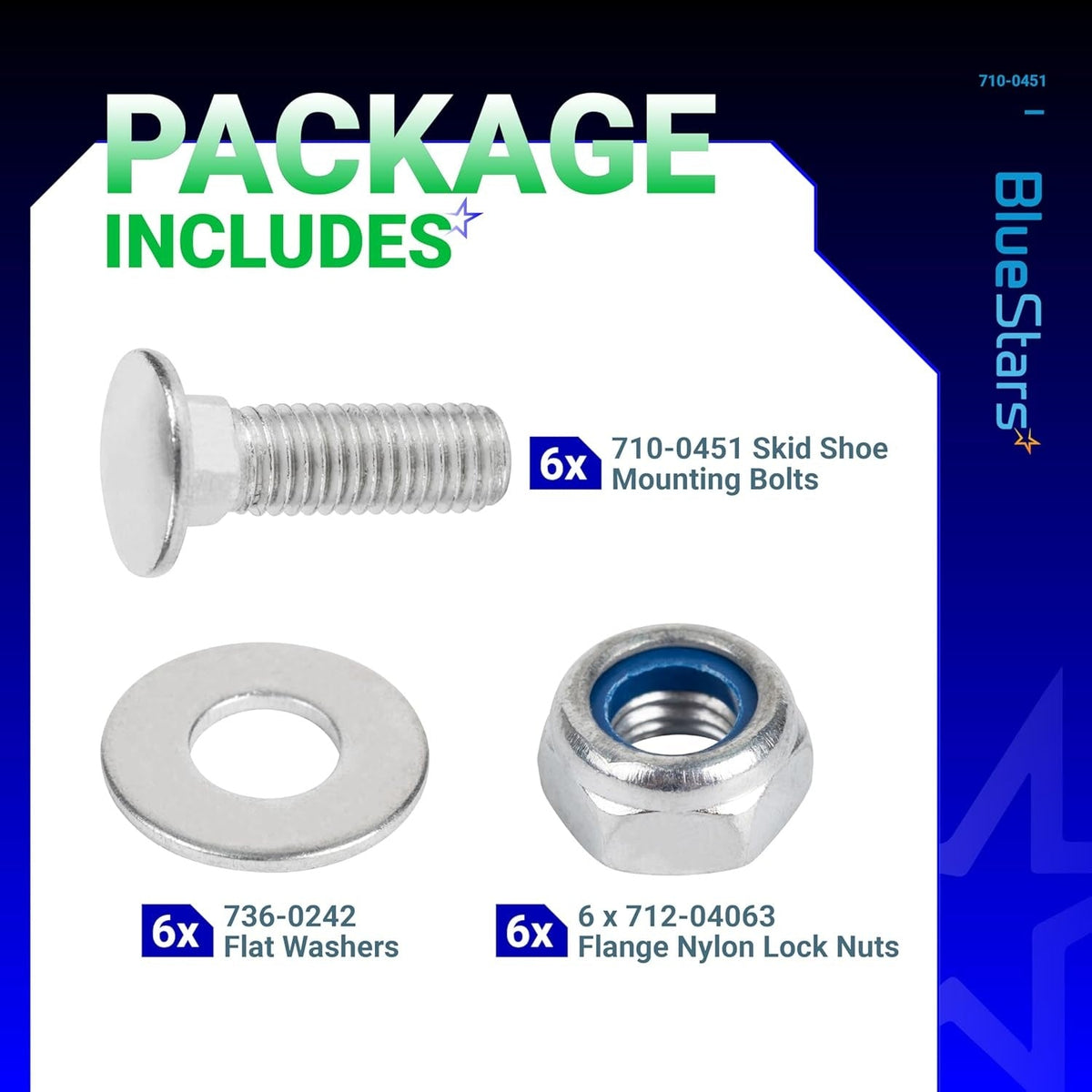 - Package Contents: 6 carriage bolts, 6 flange lock nuts, and 6 flat washers.
