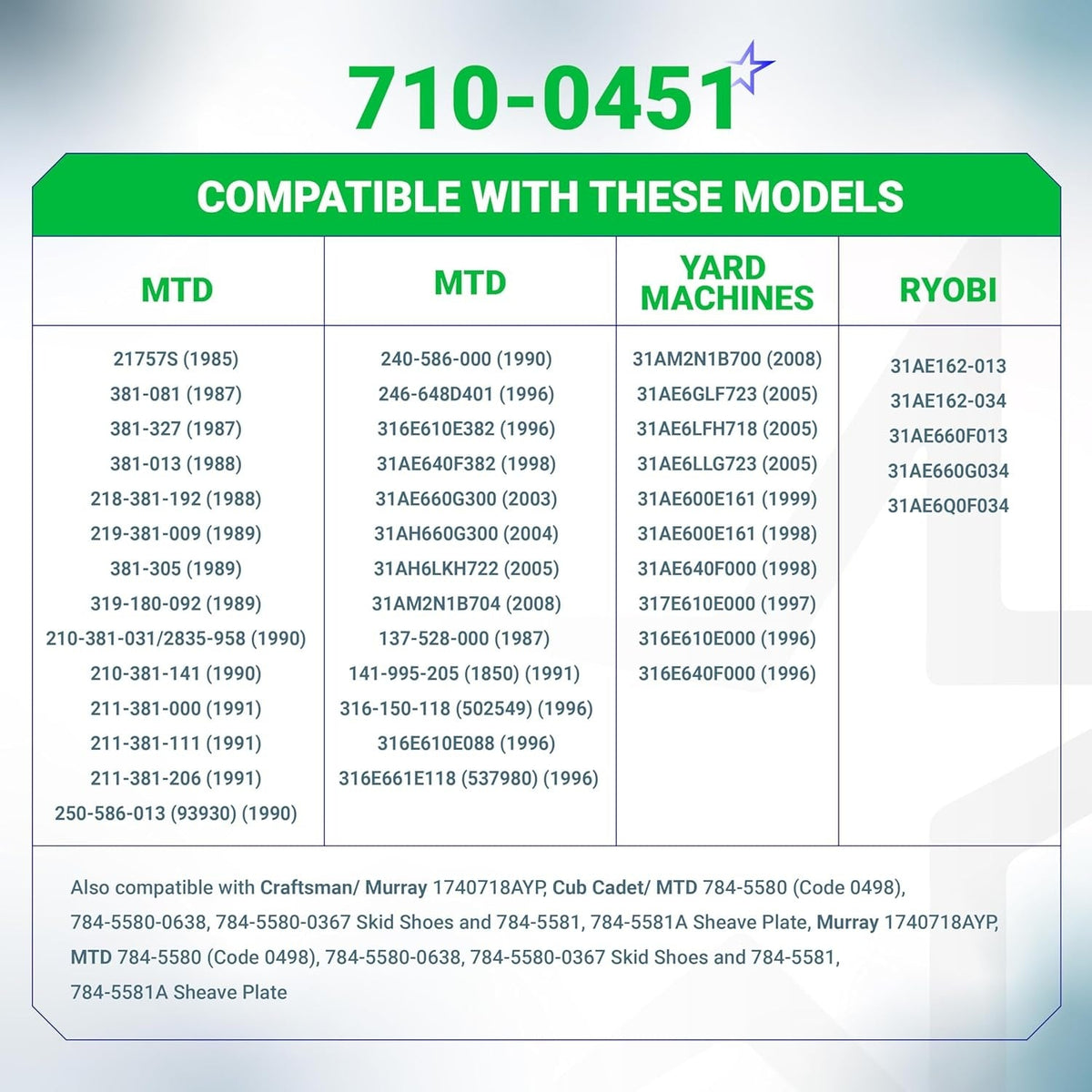 - Brands: Fits various MTD and Cub Cadet models.