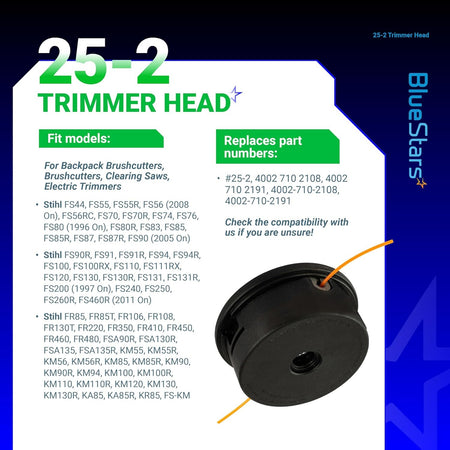 This listing offers a pair (2 pieces) of high-quality 25-2 trimmer heads, specifically designed as replacements for a variety of Stihl and Weed Eater string trimmers. Ensure compatibility and optimal performance with these reliable trimmer heads.