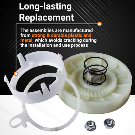 - Includes pulley, cam ring, basket drive gear, spring, housing, and nut.