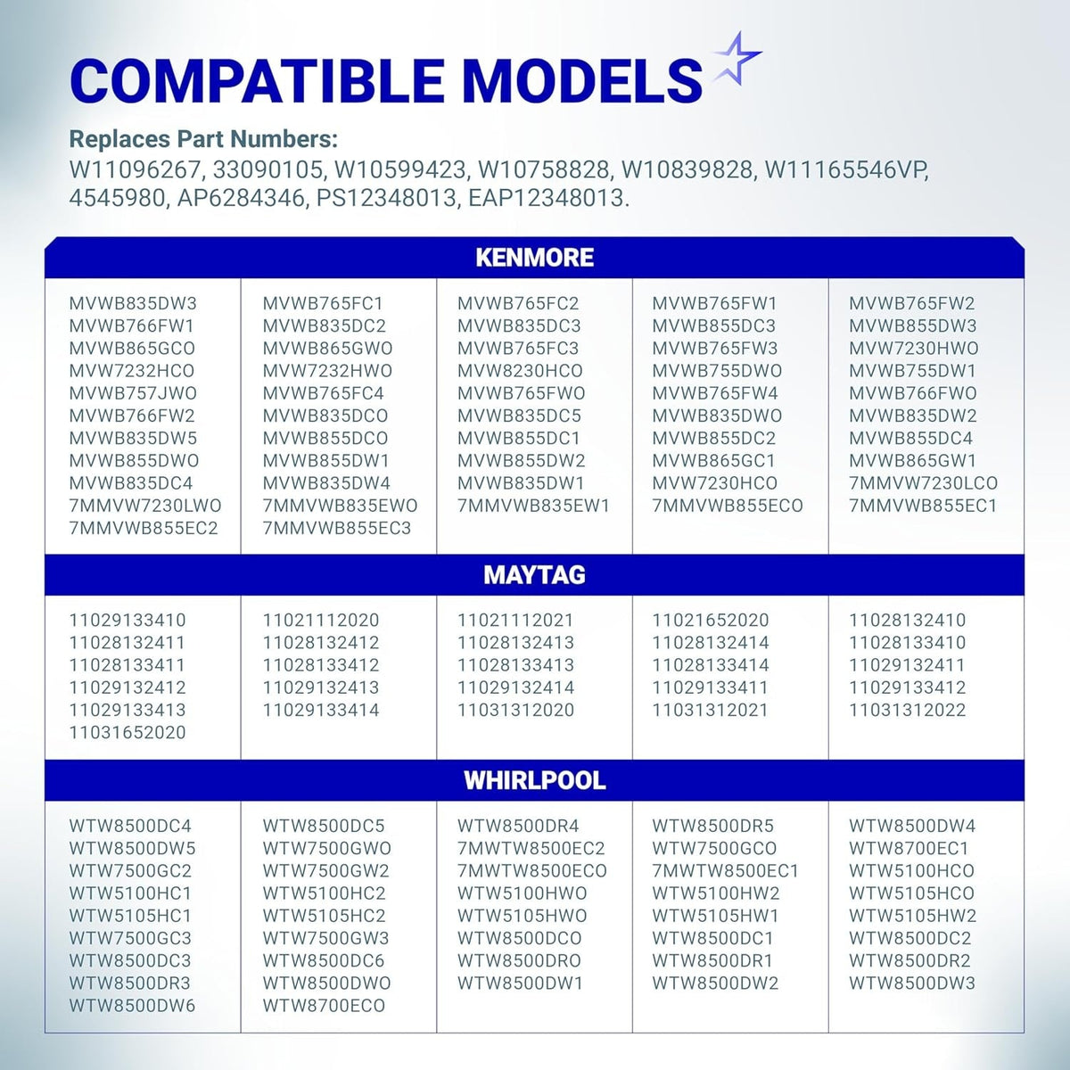 Replaces part numbers: W11096267, 33090105, W10599423, W10758828, W10839828, W11165546VP, 4545980, AP6284346, PS12348013, EAP12348013.