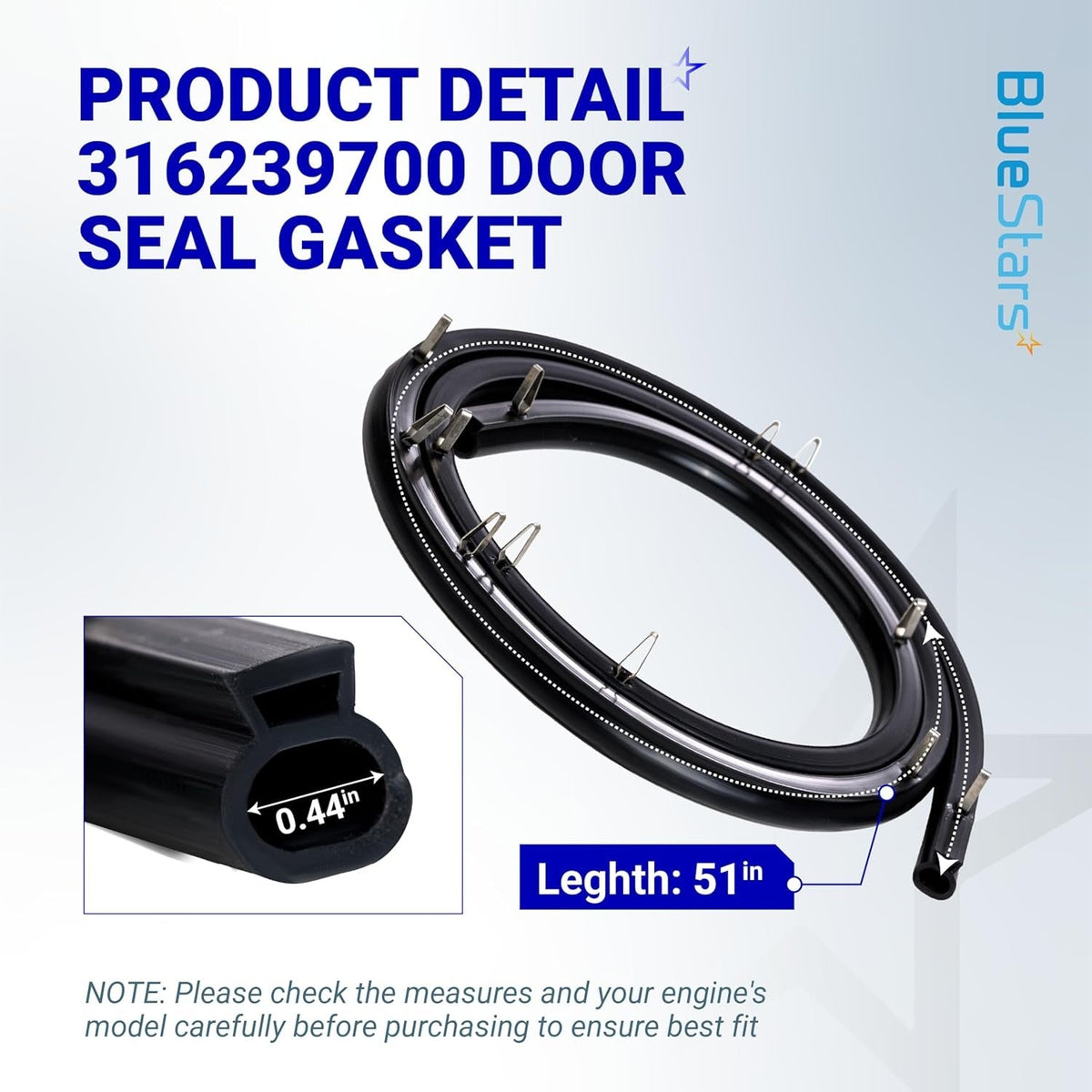 The 316239700 oven door seal and WB35x29720, WB35x29721, WB32k3 oven door seals are not universal. Please ensure the size is correct before placing your order. The length of the 316239700 range oven door seal gasket is 50.45 inches.