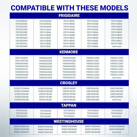 - Frigidaire: FEF303BWA, FEF303CWA, FEF303CWC, FEF303CWD, FEF303CWE, FEF303CWF, FEF303CWG, FEF303CWH, FEF303CWJ, FEF303HWA, etc.