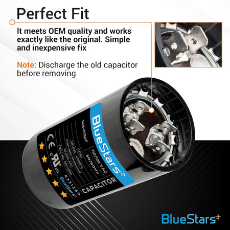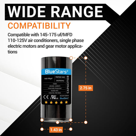 - Capacitance: 145-175 microfarads (µF or MFD)
