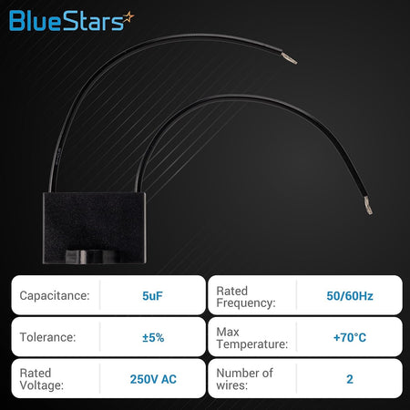 - Important: This is a 2-wire capacitor. Verify that your original capacitor also has two wires before purchasing. Check the capacitance (uF) and voltage (V) ratings on your original part to ensure a match.