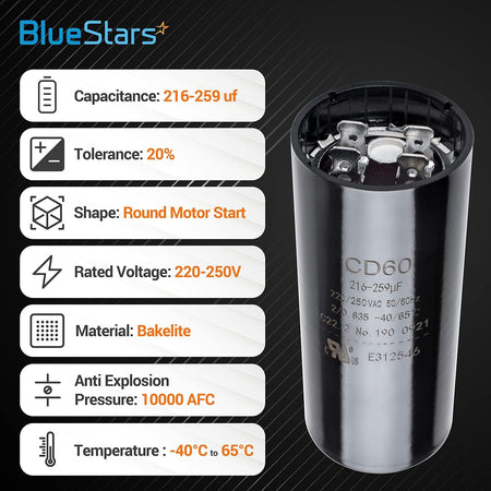 216-259 uF MFD 220-250 VAC 50/60 Hz SC0080 CD60 Round Motor Start Capacitor - Fit for AC Motor Run or Fan Start and Cool Heat Pump Air Conditioner