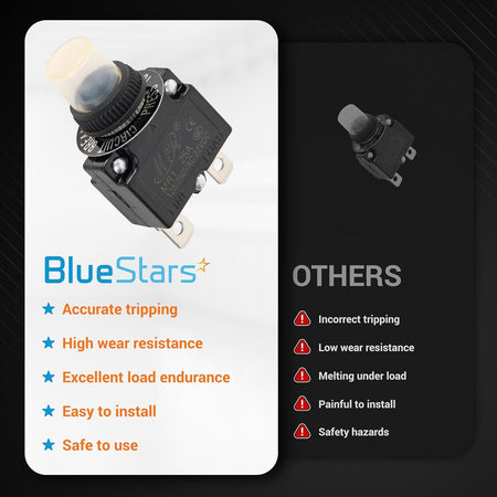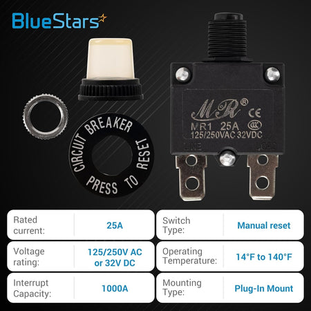A universal replacement for many 25A thermal circuit breakers that match the voltage ratings and physical dimensions. Suitable for applications requiring a push-to-reset overload protector.
