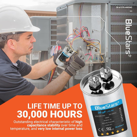 Introducing the 30 MFD uf ± 5% MFD 370 V VAC or 440 Volt 50/60 Hz Multi-Purpose Motor Run Round Capacitor Blue Stars. This capacitor is specifically designed for compatibility with air conditioners and heat pump condensers, ensuring optimal performance and reliability.