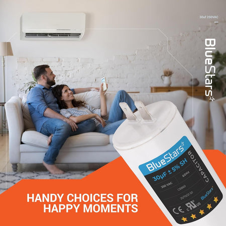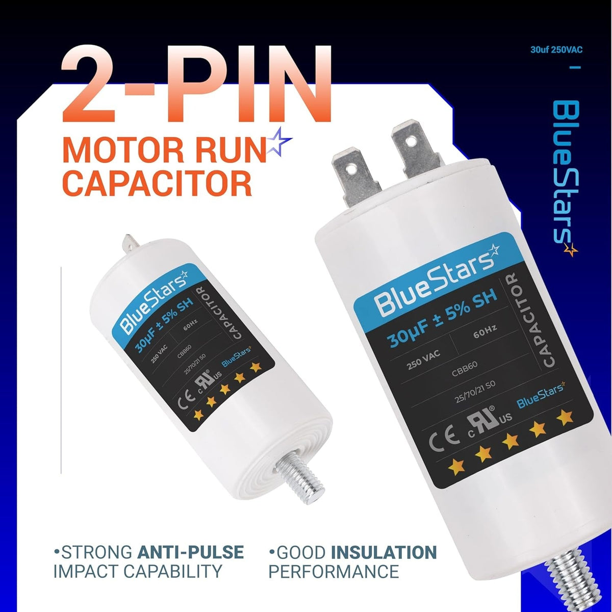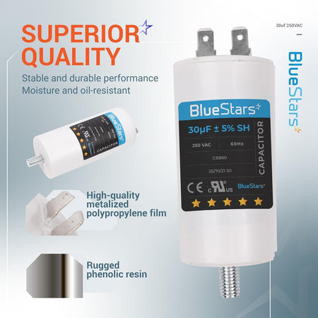 - Capacitance: 30 µF (microfarads) / 30 MFD (microfarads)