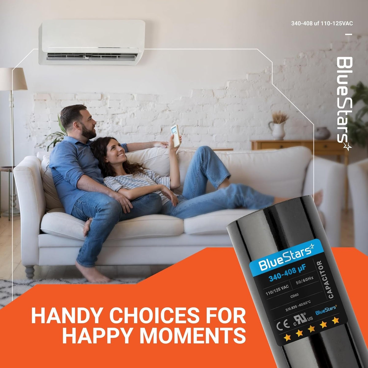 This 340-408µF, 110-125VAC ±20% round start capacitor features a distinctive blue stars design and is specifically engineered for use in single-phase electric motors and gear motors.