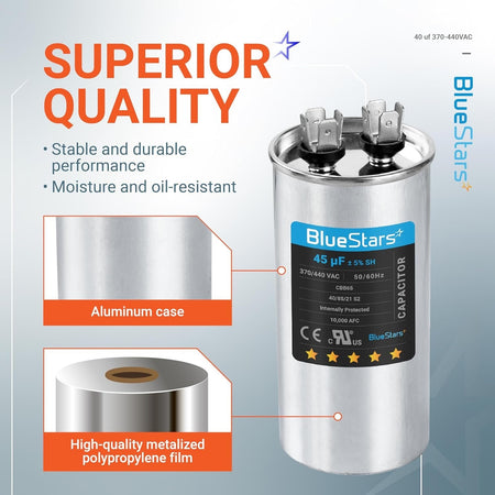 45 µF/MFD 370-440VAC Round Run Capacitor with Blue Stars