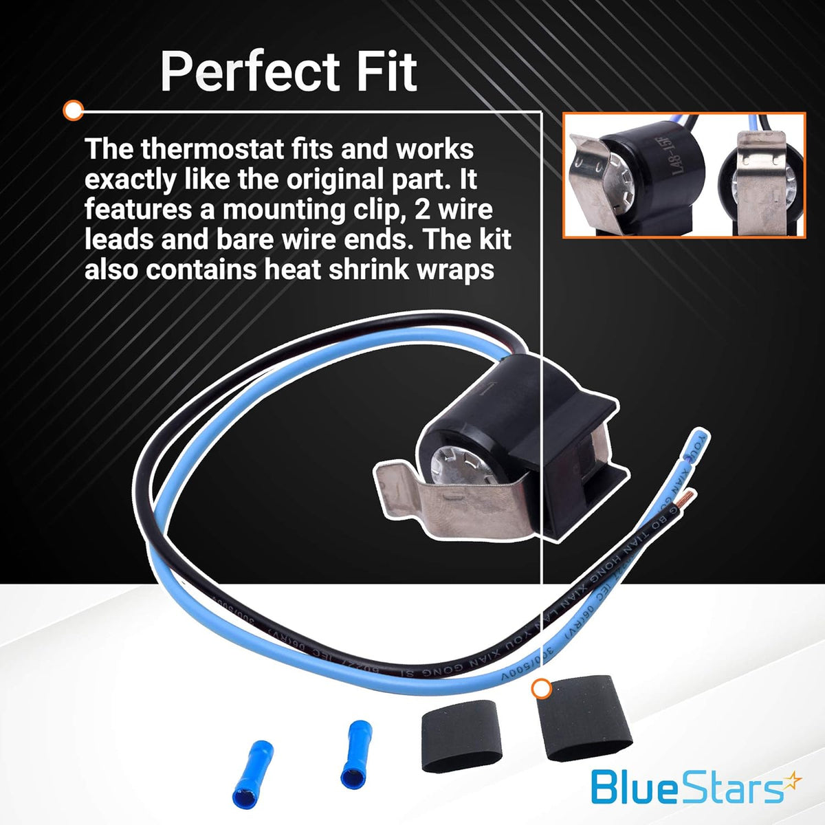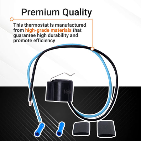 - Kit includes one defrost thermostat, wire leads, a clip, and heat shrink tubing.
