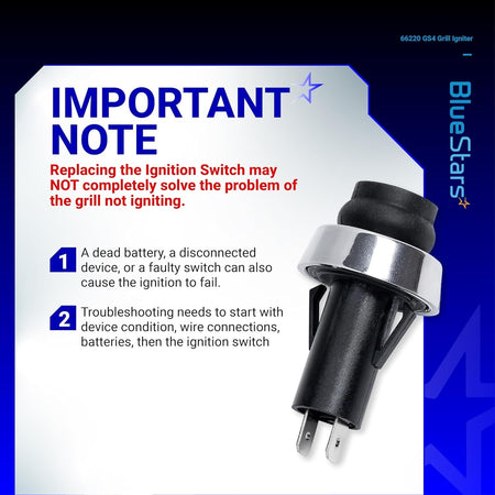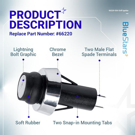 The 66220 GS4 igniter switch is engineered to produce a high-voltage spark, effectively igniting gas in your grill with a simple button press. This mechanism guarantees rapid and consistent ignition, ensuring that your food is cooked evenly.