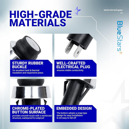The 66220 grill igniter is designed with a rubber buckle that offers exceptional thermal and heat insulation, allowing for a responsive press. The button surface is chrome-plated, providing a smooth touch and resistance to corrosion from cooking environments, including heat, oil, and dust. Additionally, the igniter features a snap-type design at the bottom, facilitating easy installation and ensuring it remains securely in place.