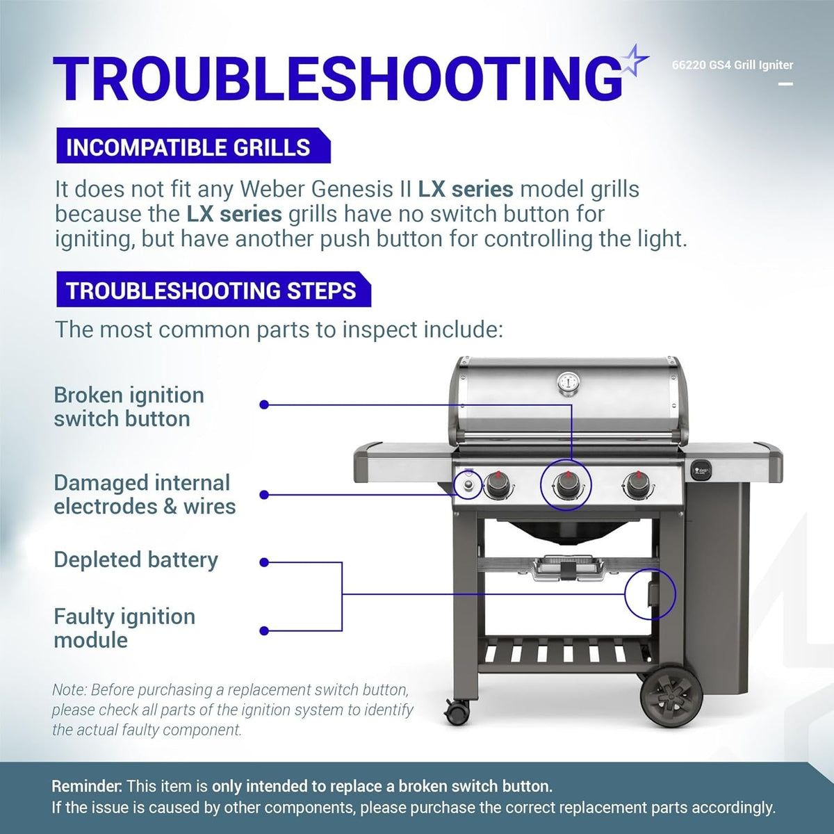 This igniter switch is compatible with a range of Weber GS4 gas grill models that feature front-mounted control panels, including: