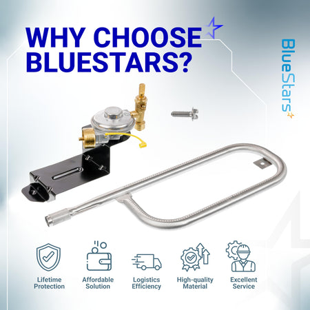 - Kit includes one gas valve regulator, one burner tube, one support bracket, and fastening hardware.