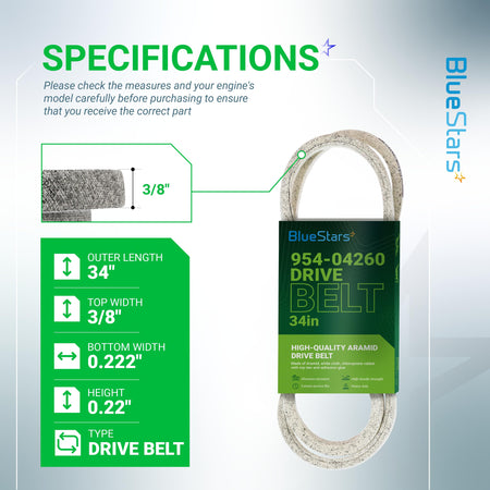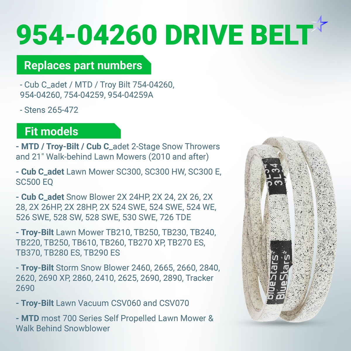954-04260 Drive Belt 3/8'' x 34'' for MTD Craftsman Cub Cadet Troy-Bilt Snowblower 21" Walk-Behind Lawn Mower