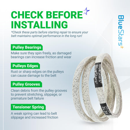 - Verify correct belt tension after installation to prevent slippage or excessive wear. Do not over-tighten.