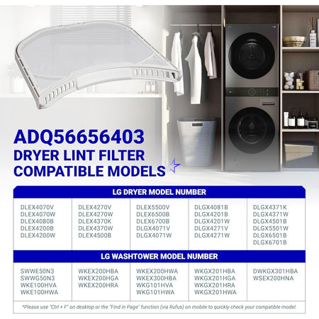 LG Clothes Dryer: DLEX4070V DLEX4070W DLEX4080B DLEX4200B DLEX4200W DLEX4270V DLEX4270W DLEX4370K DLEX4370W DLEX4500B DLEX5500V DLEX6500B DLEX6700B DLGX4071V DLGX4071W DLGX4081B DLGX4201B DLGX4201W DLGX4271V DLGX4271W DLGX4371K DLGX4371W DLGX4501B DLGX5501W DLGX6501B DLGX6701B; LG WashTower: SWWE50N3 SWWG50N3 WKE100HVA WKE100HWA WKEX200HBA WKEX200HGA WKEX200HRA WKEX200HWA WKEX300HBA WKG101HVA WKG101HWA WKGX201HBA WKGX201HGA WKGX201HRA WKGX201HWA WKGX301HBA WSEX200HNA