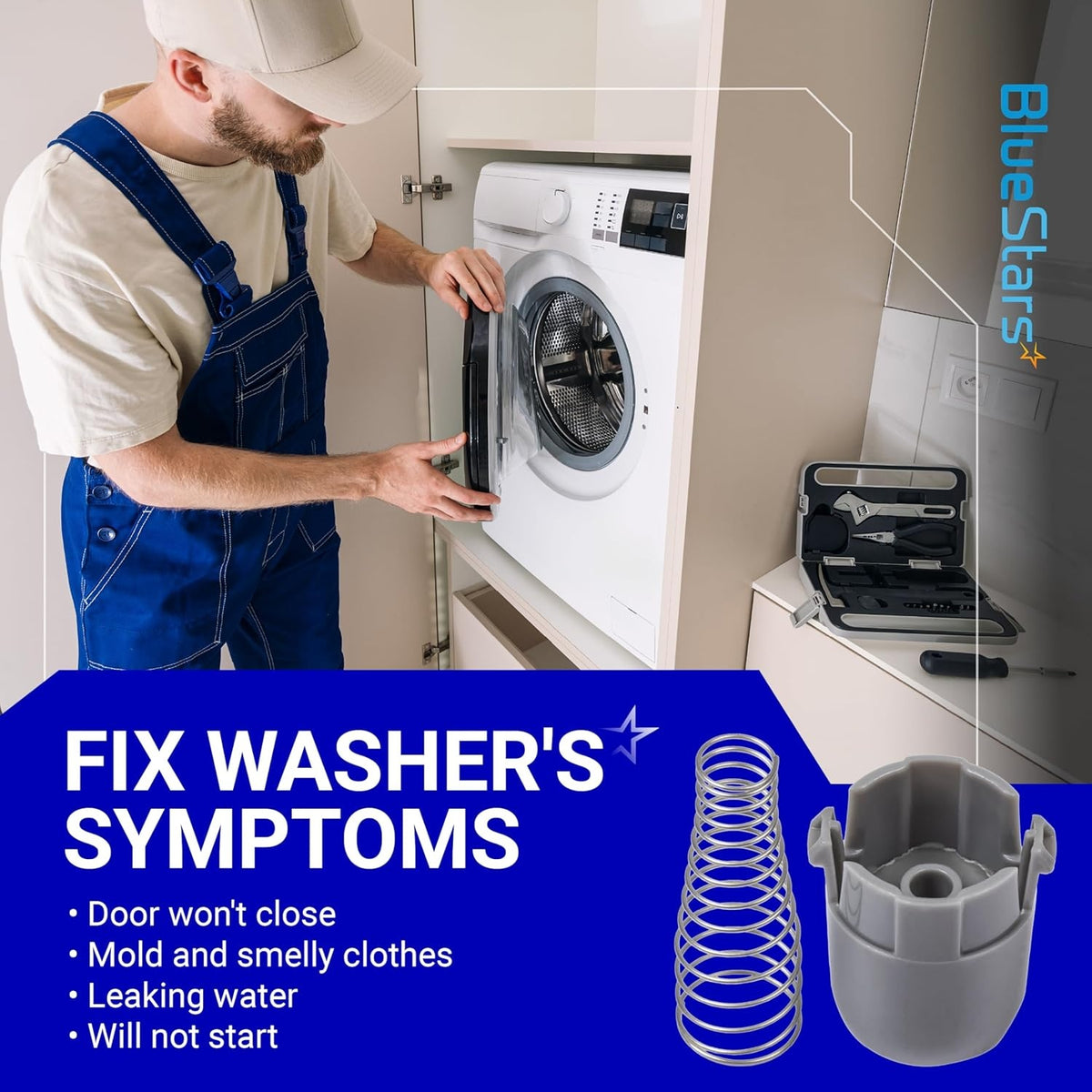 - Magnetic plunger holds the washer door partially open after a cycle.