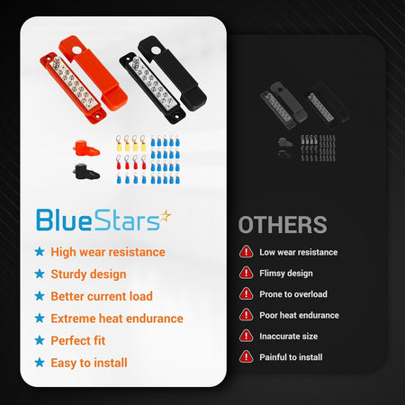 • Package Contents: 1x Red Bus Bar (Positive), 1x Black Bus Bar (Negative), 24x #8 Wire Lugs, 8x 1/4" Wire Lugs