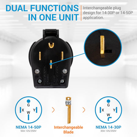 Easily switch between NEMA 14-30P and NEMA 14-50P plugs as needed for different power requirements