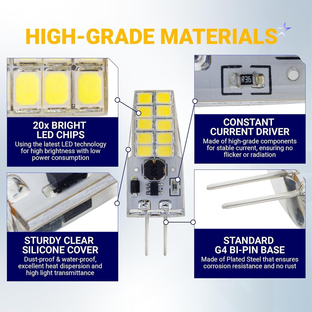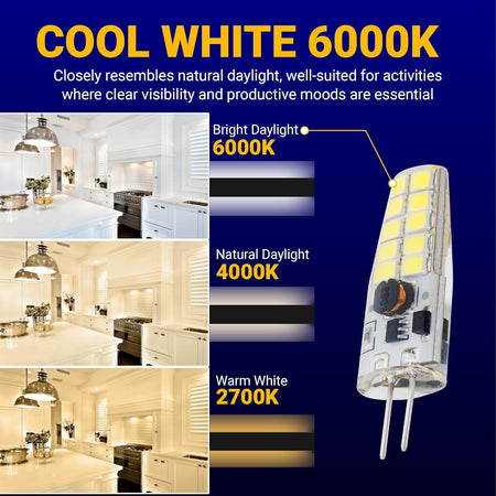 - Direct replacement for standard T3 / JC type G4 bi-pin base halogen bulbs.