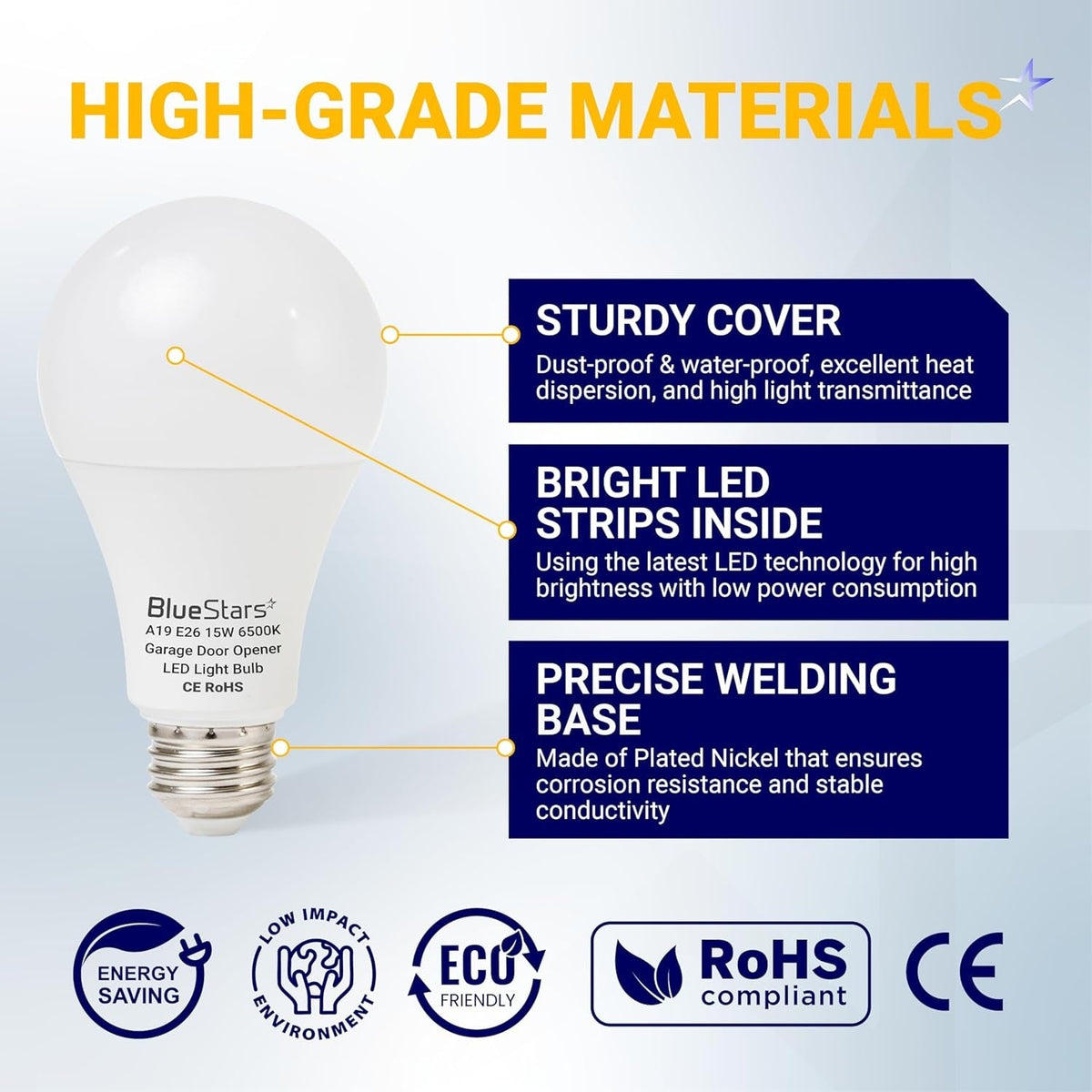 The BlueStars A19 E26 15W LED Bulb is compatible with E26/E27 American standard bases, making it suitable for most garage door openers and easily integrated into any E26/E27 lighting fixture. With 800 lumens of super bright lighting, it is ideal for: