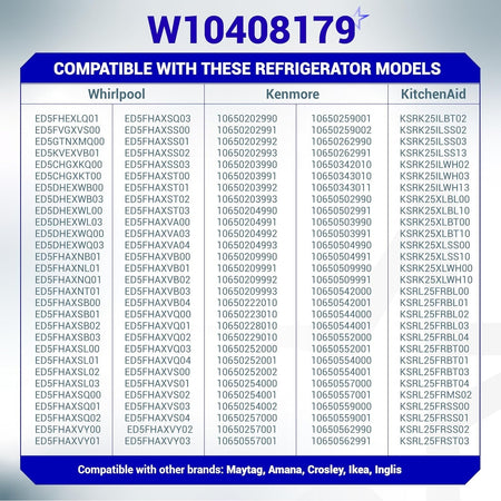 - Fits specific refrigerator models from major brands including Whirlpool, KitchenAid, Kenmore, and Maytag.