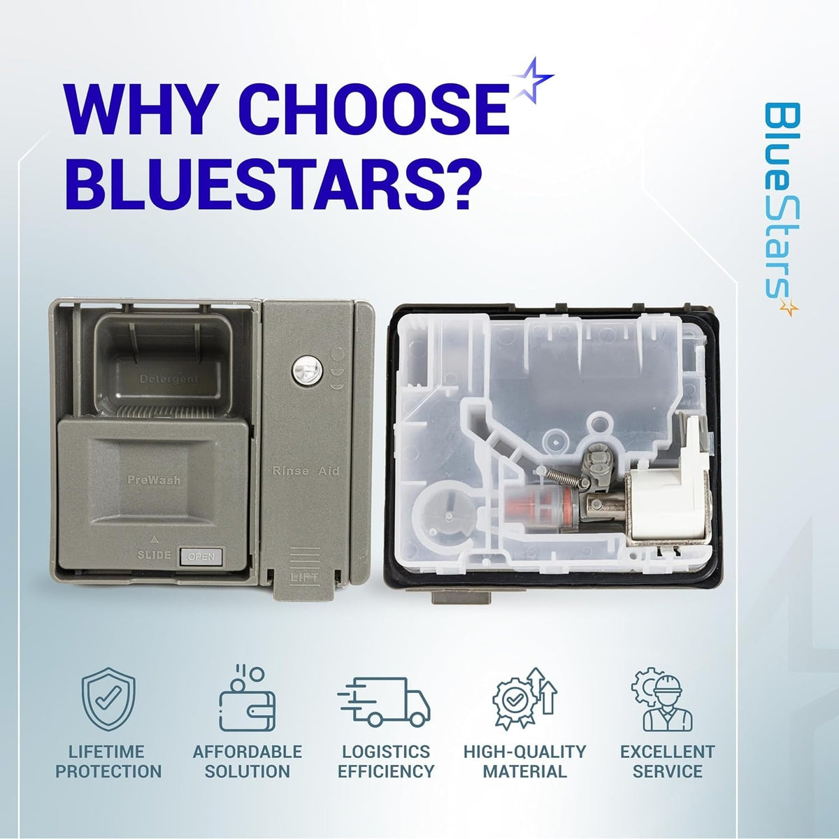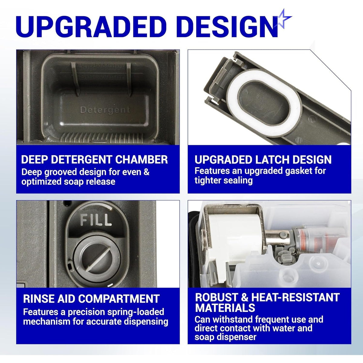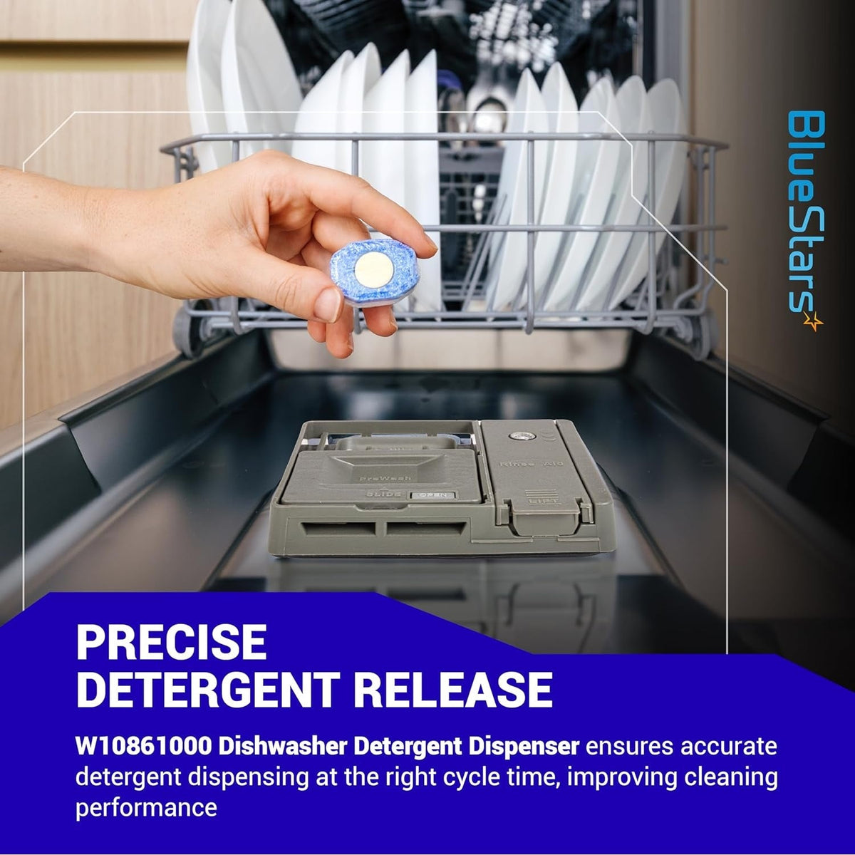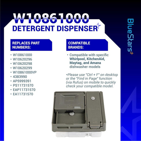 Experience superior quality and performance with the BlueStars Upgraded W10861000 W10620296 Detergent Dispenser. Designed for durability and efficiency, this essential appliance component is perfect for your dishwasher needs.