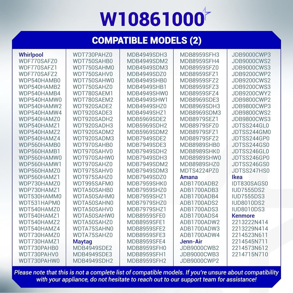 - Wide Compatibility: Replaces multiple part numbers including W10861000, W10620296, and more. Compatible with various Whirlpool, KitchenAid, MDB, and Amana models.
